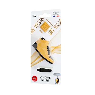 Aromatizuesi i ri i ajrit Vinove Netro Shoe Las Vegas është një kombinim unik i një polimeri të parfumuar, i projektuar si një atlete legjendare ikonë me ngjyrë të verdhë. Ky freskues ajri me një aromë intensive të mbushur me qelibar, që përmban aromën e gëzueshme të bergamotës dhe piperit dhe karakterin sensual të vjollcave me lule të kombinuara me trëndafil dhe një aromë vaniljeje. Teknologjia Vinove siguron që polimeri liron gradualisht aromën, duke siguruar deri në 45 ditë (më shumë se 6 javë) freski intensive dhe afatgjatë në makinë. Ky freskues ajri Netro Shoe mund të vendoset në makinë në dy mënyra të ndryshme. Me kapësen e montimit, mund të vendoset horizontalisht ose vertikalisht në grilën e ventilimit ose të varet në pasqyrën e pasme. Freskuesi i ajrit Vinove Netro Shoe është i sigurt për pjesën e brendshme të makinës.
