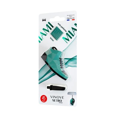 Aromatizuesi i ri i ajrit Vinove Netro Shoe Miami është një kombinim unik i një polimeri të parfumuar, i projektuar si një atlete legjendare me ngjyrë jeshile, ikonë. Ky freskues ajri me një kombinim të rafinuar aromash të freskëta agrume, vanilje dhe bergamot. Teknologjia Vinove siguron që polimeri të lëshojë gradualisht aromën, duke siguruar deri në 45 ditë (më shumë se 6 javë) freski intensive dhe afatgjatë në makinë. Ky freskues ajri Netro Shoe mund të vendoset në makinë në dy mënyra. Mund të vendoset horizontalisht ose vertikalisht në grilën e ventilimit duke përdorur kapësen ose të varet nga pasqyra e pasme. Vinove Netro Shoe është i sigurt për brendësinë e makinës.