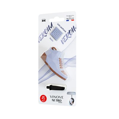 Aromatizuesi i ri i ajrit Vinove Netro Shoe Verona është një kombinim unik i një polimeri të parfumuar, i projektuar si një atlete legjendare me ngjyrë vjollcë, ikonë. Ky freskues ajri ka një aromë misterioze druri arre, konjaku, kafeje dhe një fuqi mbështjellëse lajthie, portokalli me ëmbëlsinë e mjaltit, ananasit dhe vaniljes. Teknologjia Vinove siguron që polimeri liron gradualisht aromën, duke siguruar deri në 45 ditë (më shumë se 6 javë) freski intensive dhe afatgjatë në makinë. Ky freskues ajri Netro Shoe mund të vendoset në makinë në dy mënyra të ndryshme. Me kapësen e montimit, mund të vendoset horizontalisht ose vertikalisht në grilën e ventilimit ose të varet në pasqyrën e pasme. Freskuesi i ajrit Vinove Netro Shoe është i sigurt për pjesën e brendshme të makinës.