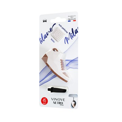 Aromatizuesi i ri i ajrit Vinove Netro Shoe Milano është një kombinim unik i një polimeri të parfumuar, i projektuar si një atlete legjendare me ngjyrë të bardhë, ikonë. Ky freskues ajri me një aromë dalluese dhe të guximshme kardamoni, një aromë speci djegës dhe menteje të plotësuar nga nota delikate gjethesh vjollce dhe aromë të freskët sherbele, ananasi, kanelle dhe gështenje. Teknologjia Vinove siguron që polimeri liron gradualisht aromën, duke siguruar deri në 45 ditë (më shumë se 6 javë) freski intensive dhe afatgjatë në makinë. Ky freskues ajri Netro Shoe mund të vendoset në makinë në dy mënyra. Mund të vendoset horizontalisht ose vertikalisht në grilën e ventilimit duke përdorur kapësen ose të varet nga pasqyra e pasme. Vinove Netro Shoe është i sigurt për brendësinë e makinës.